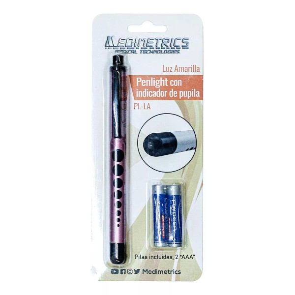 Lámpara LED para exploración de pupilas de 15 cm / 6" de largo, fabricada en aluminio, marca Medimetrics. Recomendada para examen ocular. Su luz amarilla permite iluminar mejor zonas de difícil acceso realzando los colores. Cuenta con indicador de pupila y pinza para bolsillo. Incluye 2 baterías AA.