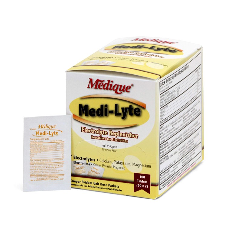 Product DescriptionMedique 03033 Medi-Lyte Electrolyte Tablets w/ Potassium Chloride for Cramps, 100-TabletsFrom the ManufacturerMedique 03033-100 electrolyte replacement tablets specially formulated to provide necessary replenishment for employees who must work in heat stress environments. Better tasting, easy to swallow microfilm coated tablet.