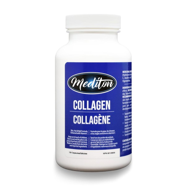 Mediton Collagen Supplement, 120 Capsules, 500mg Hydrolyzed Collagen with Vitamin C, Healthy & Youthful Skin, Strengthens Hair & Nails, Bone & Joint Health Support, Made in Canada