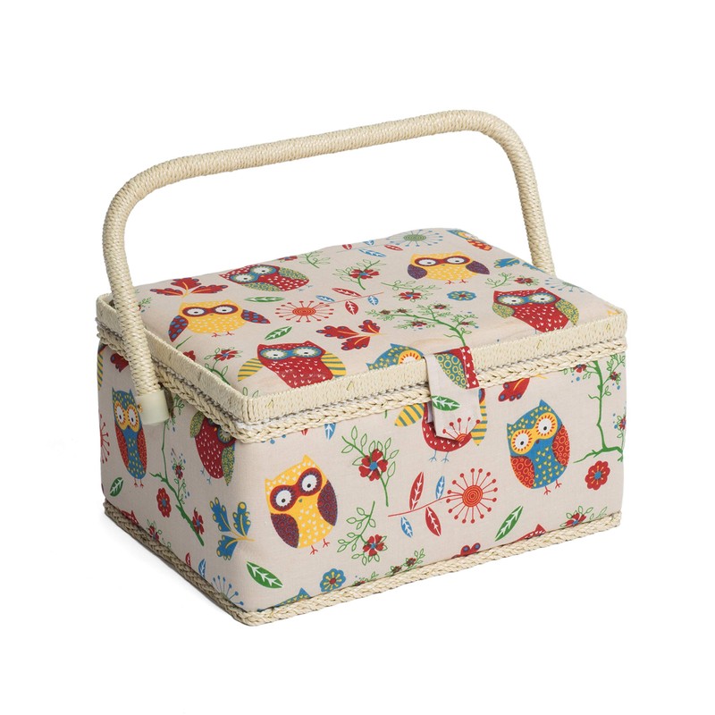 Brighten up any workroom with this 'Bright Owls on Cream' Sewing Box. Contains colour coordinated plastic inner tray to help organise your smaller sewing accessories. MEDIUM - Depth 18.5cm x Width 26cm x Height 15cm. Internal colour coordinated satin lining with pin cushion and handy pocket. Magnetic covered front fastening. Convenient and sturdy carry handle