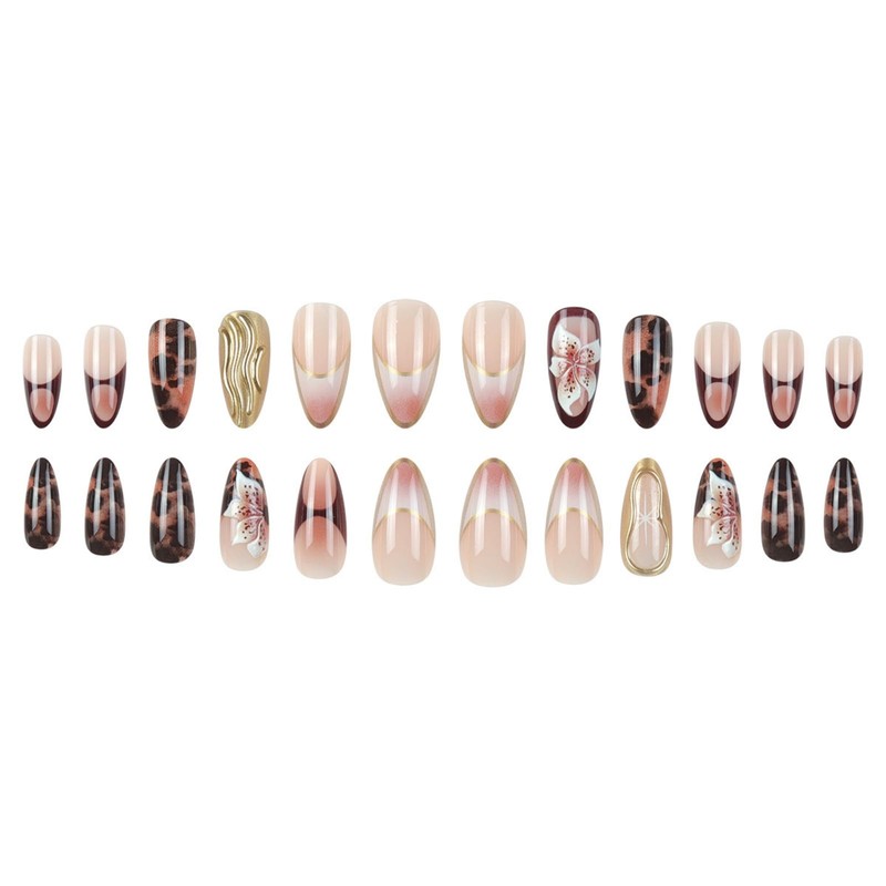 Medium Press on Nails Almond Fake Nails French False Nails Brown Artificial Nails with Gold Charm Designs 3D Flowers Handmade Nails Floral Stick on Nails for Women 24pcs
