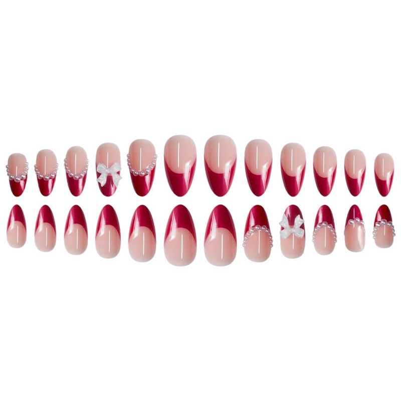 Medium Press on Nails Almond Fake Nails French False Nails Red Artificial Nails with White Bow Designs Stick on Nails for Women 24pcs