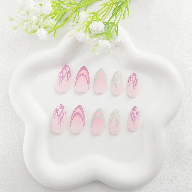 Medium Press on Nails Almond Fake Nails Purple Green Lines Flame Designs Glue on Nails Blooming Acrylic Nails Press ons Medium Almond False Nails Cute Artificial Stick on Nails for Women 24Pcs