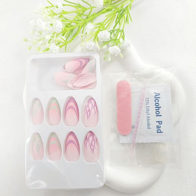 Product Type: Medium Almond NailsMaterial: ABSColor: As shown in the pictureQuantity: 24pcs/box Women Press on NailsHow to use?1. Gently wipe the nail plate with a nail stick to remove the surface cuticle, rinse well and keep the nails clean2. Choose the size that best suits your nails, take an appropriate amount of glue or jelly glue on the inside of the selected nail plate.3. Press the false nails on your own nails and hold for 30 seconds.4. Trim according to the shape and length of the press-on nails you want.How to remove?1. Soak the nails in warm water, and after a few minutes, gently peel off the pre-glued nails from the side.2. Tear off the glue sticker and keep the false nail tip for next use.Notice:1. Do not wet your fingers within one hour after wearing false nails.