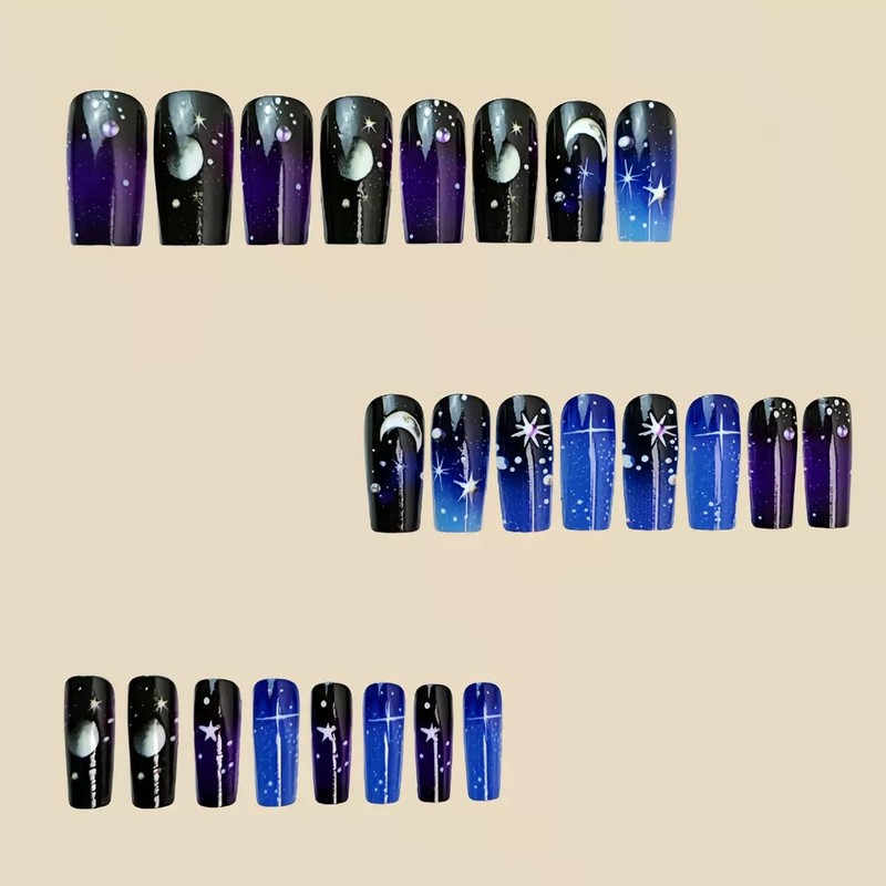 Medium Press on Nails Coffin Fake Nails Purple Blue False Nails Ombre Acrylic Nails with Star Moon Design Stick on Nails Glossy Full Cover Glue on Nails for Women Manicure 24Pcs