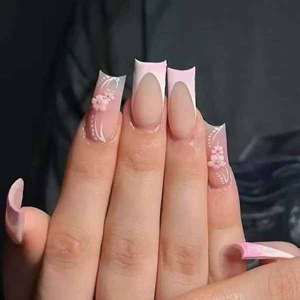 Medium Press On Nails Square Fake Nails French Tip False Nails With Flower Design Pin Acrylic Nails Full Cover Reusable Glue On Nails Artificial Nails Glossy Stick On Nails For Women 24pcs