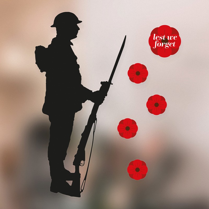 - Soldier Silhouette with Poppies – Our medium soldier silhouette window sticker with 5 individual Poppy window stickers is a fitting reminder of our fallen heroes during remembrance period. One Poppy has the Lest We Forget remembrance phrase.