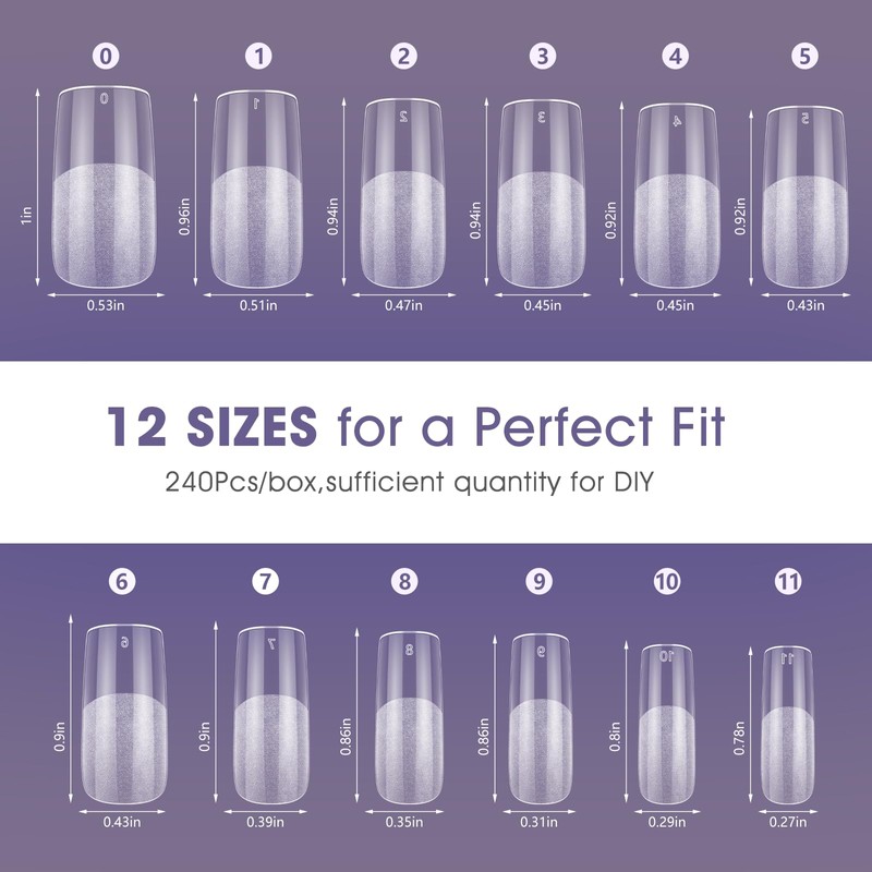 - 12 Sizes for Perfect Fit: Our premium clear nail tips include 12 carefully designed sizes (240pcs/box).Clearly numbered 0-11 for quick finding your size.The upgraded storage box is portable, making it suitable for both daily use and travel