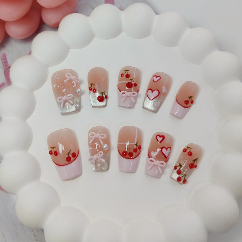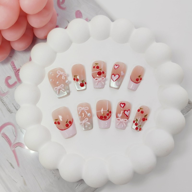 - DESIGN: Our short/medium square/coffin stick on nails are all handmade by experienced and aesthetic nail artists. The press ons have glitter cat eye/hand-painted flowers/graffiti/black cat/plaid/stripes/cherry/bow knot/polka dots/french tip on them, and with 3D stripes/dots/rhinestone/pearls/bead/chain/golden sequin trim, stylish, exquisite and unique