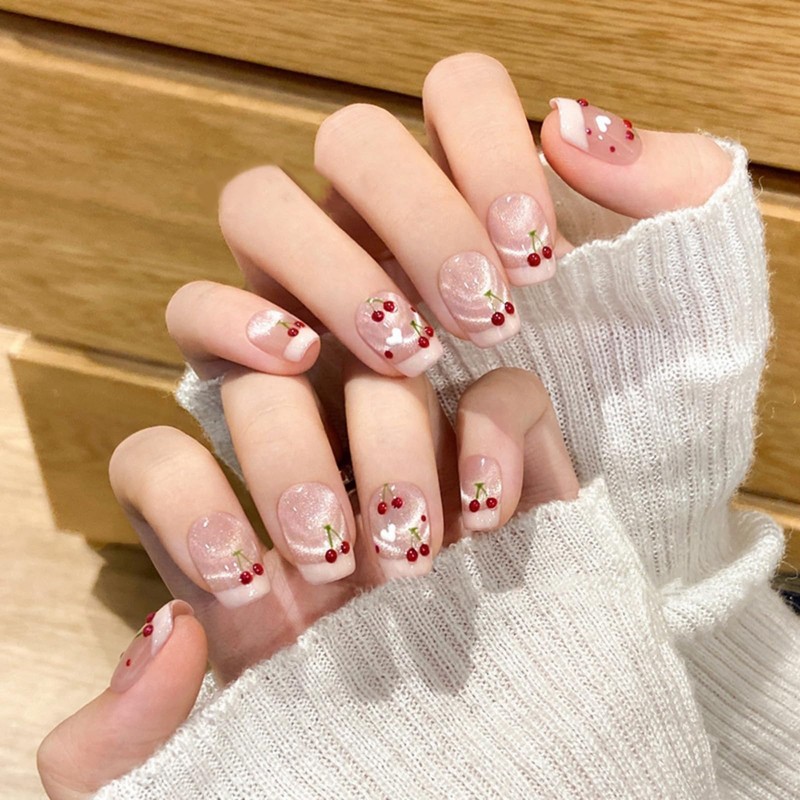 Medium Square Press on Nails French Tip Handmade False Nails with Designs/Charms, Y2k Short Coffin Reusable Fake Nails (Cherry+Pink Cat Eye, S)