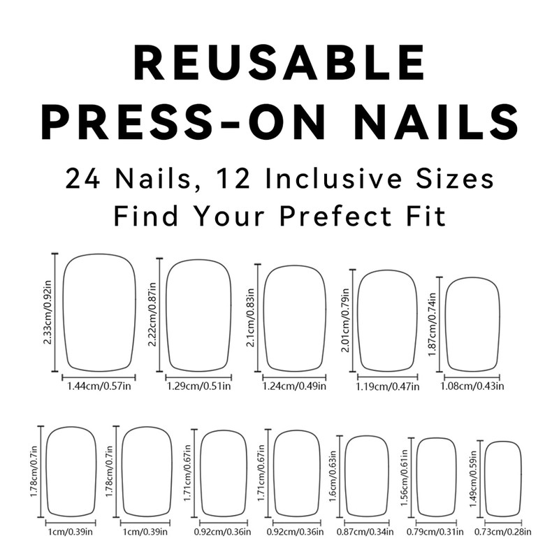 - 【Complete Set】: This set includes 24 reusable press-on nails in 12 sizes for a perfect fit. It also contains jelly gel for adhesion, a nail file, alcohol cotton for prepping, and a wooden stick for precise application. Enjoy salon-quality nails at home with this complete kit