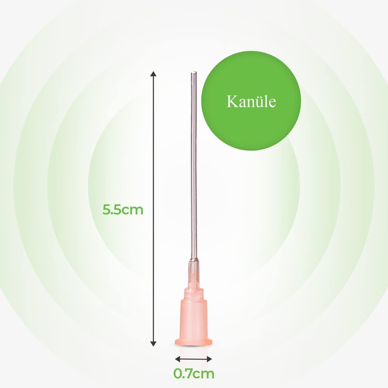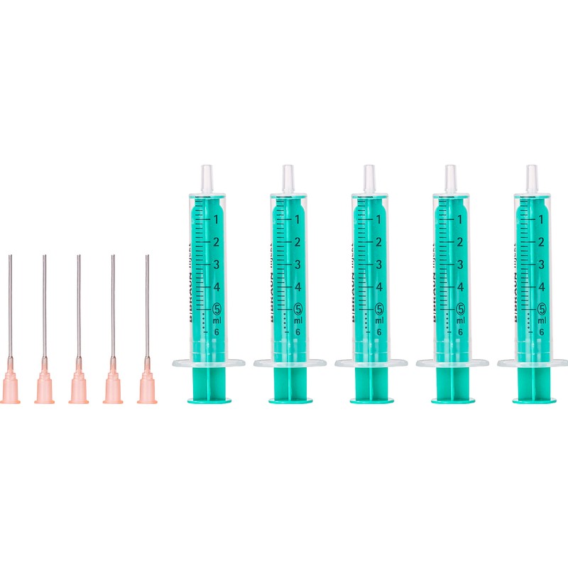 • Set consists of: 5 x syringe 5 ml and 5 x blunt cannula 1.20 x 40 mm. The disposable syringes are made of plastic and are stable, silicone-free, latex-free and individually sterile packed