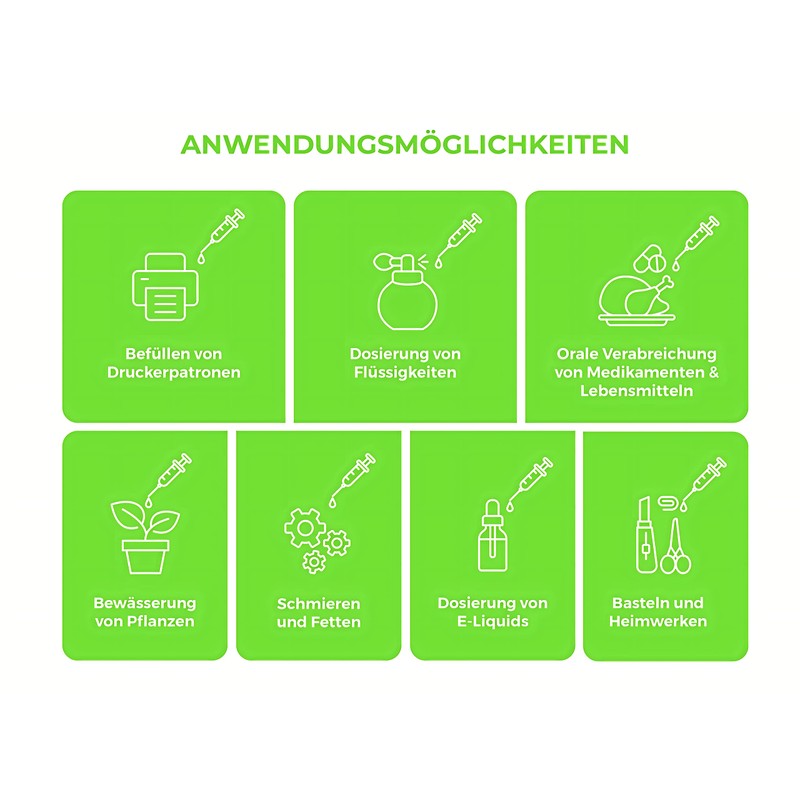 - Applications: ink cartridges, paste, perfume, crafts & DIY, watering plants, animal feeding, mixing colours, etc.