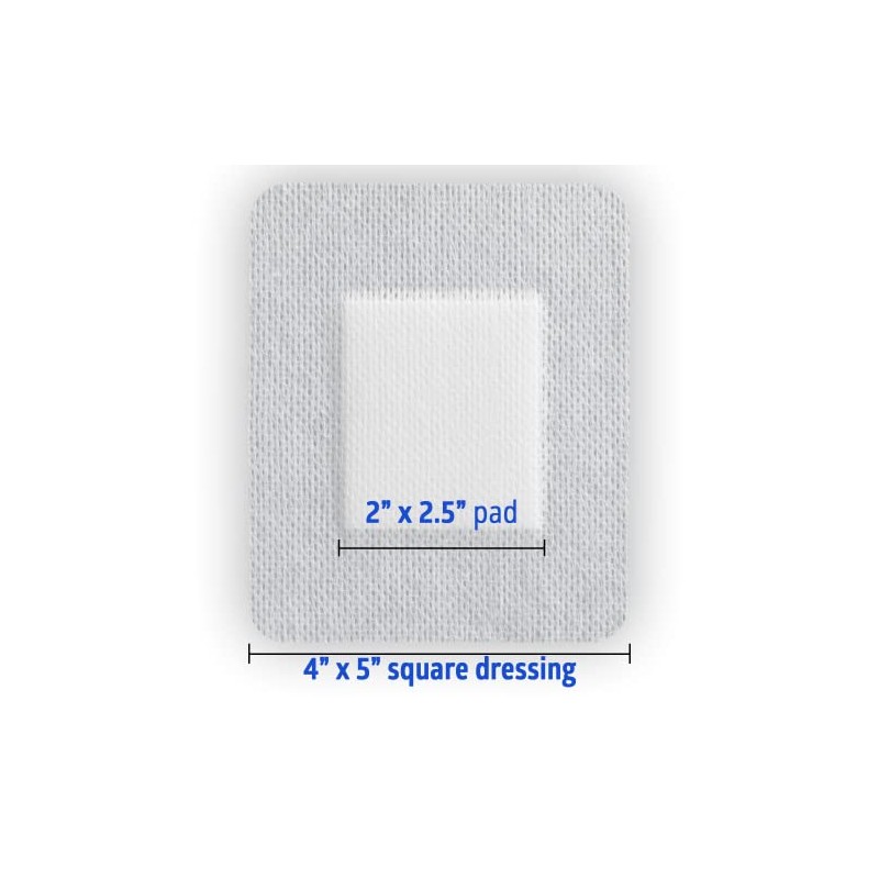 - Easy-to-use sterile adhesive island wound dressing measures 4" x 5" with 2" x 2.5" pad.