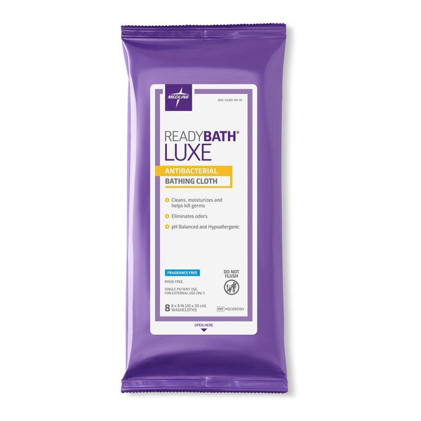 Medline ReadyBath LUXE Antibacterial Extra Thick Adult Bath Wipes (8 Wipes), Unscented, No Rinse Formula with Aloe, Shower Wipes for Sensitive Skin, Hypoallergenic & Alcohol-Free, 8 x 8 Inch