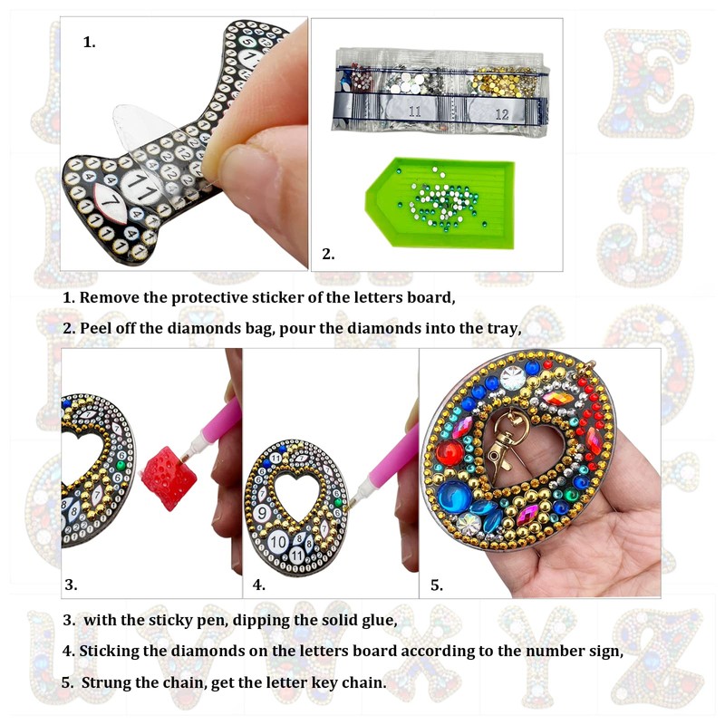 - 💝 How to Create DIY Diamond Painting Keychains 💝 -- Each diamond kit and letters board includes numbered signs such as "1," "2," "3," and so on. Using the provided tool kit, stick the diamonds onto the corresponding numbered signs on the letters board.