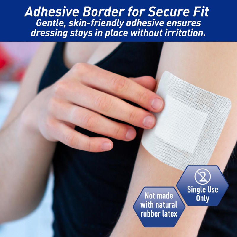 - EASY TO USE & CHANGE: Targeted wound dressing that is completely hassle free and easy to do, much more so than regular gauze and tape. The adhesive borders help it to stay in place, absorb small leakages, and protect the affected area.