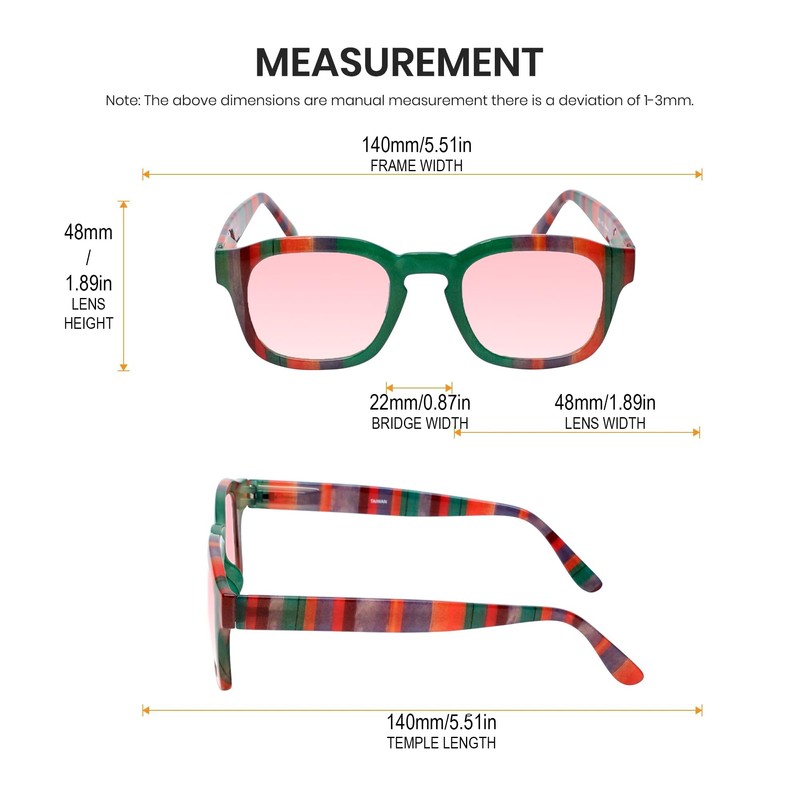 Optimized Frame Dimensions: These glasses are not only functional but also made to fit comfortably. The precise dimensions of the frame - lens width of 48mm (1.89 inches), lens height of 48mm (1.89 inches), frame width of 140mm (5.51 inches), temple length of 140mm (5.51 inches), and a bridge width of 22mm (0.87 inches) - ensure a secure and comfortable fit for both men and women. The detailed measurements are engineered to provide effective protection against various light sources while maintaining a stylish look.