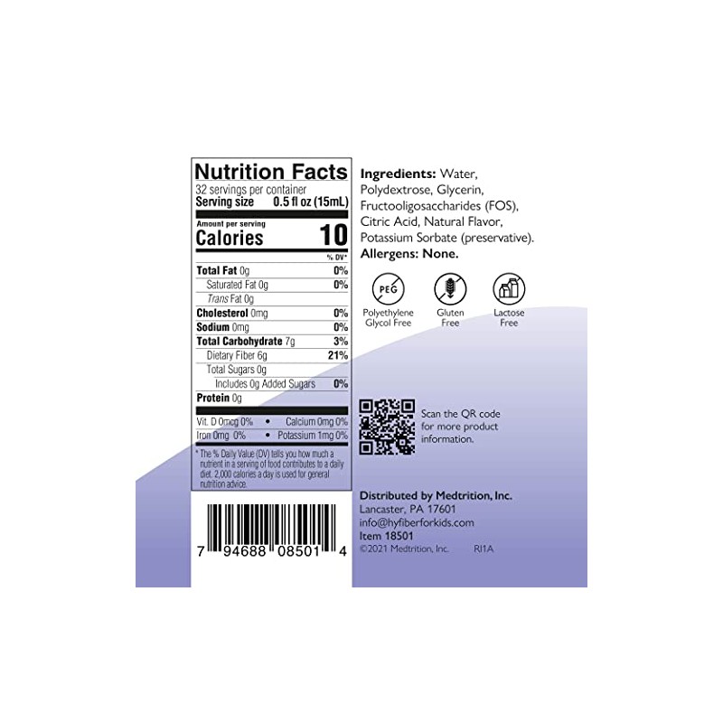 HyFiber for Kids is a clear liquid soluble fiber that contains FOS prebiotics, which feeds the good bacteria in a child's gut to promote a regular, healthy digestive system.HyFiber for Kids is a safe and effective way to increase your child's fiber intake without large quantity servings.One-tablespoon (1/2 fluid ounce) contains 6 grams of fiber, which is more than most leading brands.It is great for busy families since you do not have to mix it with other products, and it does not require refrigeration.Help to manage constipation during potty training.