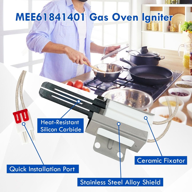- 【Replacement Part Number】:The MEE61841401 Gas Oven Igniter is a high-quality flat-style replacement part compatible with various OEM numbers, including MEE61841403, MEE63084901, AP5214765, PD00001851, EA3535362, and more. If your LG gas oven struggles with no heat, weak flames, ignition failure, or gas odor, this igniter provides a perfect fix. Works seamlessly in single or double ovens.