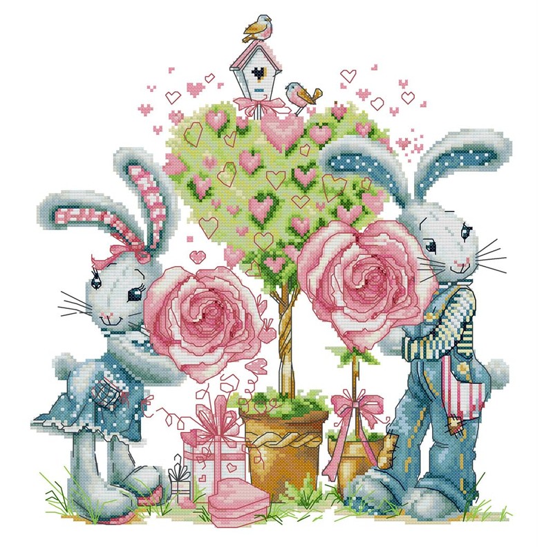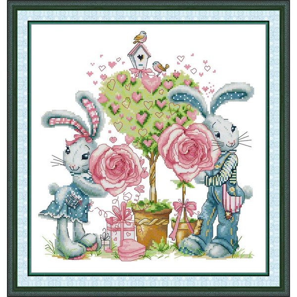 Meecaa Cross Stitch Kits 14 Count Stamped, Bunny Rose Tree Love Embroidery Kit with Accessories Pre Printed(38×41CM (Bunny)