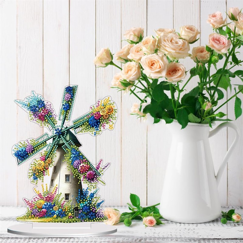 Meecaa Windmill Flower DIY Diamond Desktop Ornament Kit Special Shaped Crystal Diamond Painting Tabletop Ornaments Single Sided Diamond Home Decor (Windmill 1)