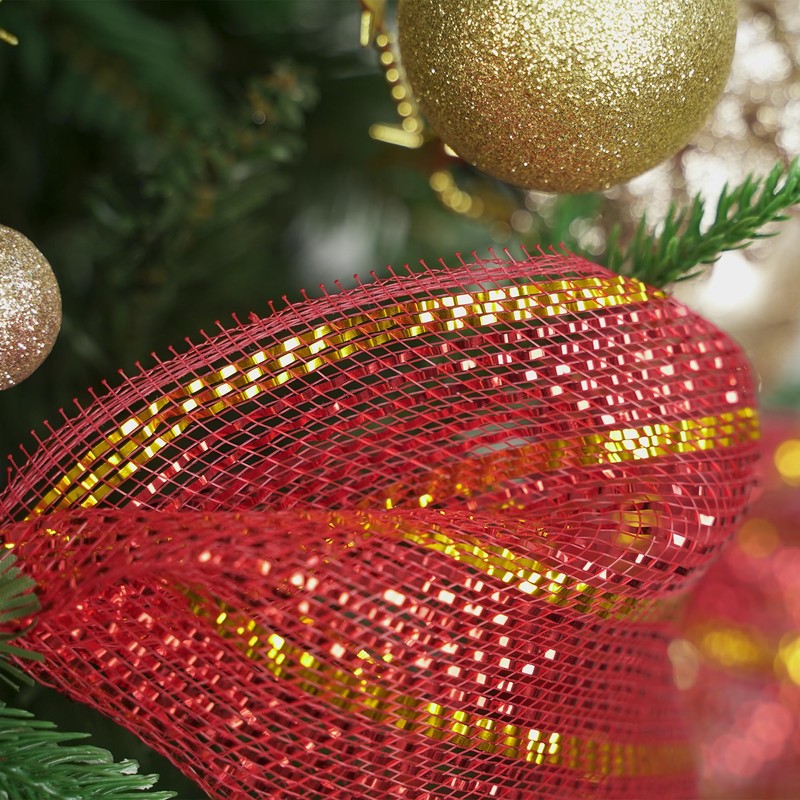 - A 10-inch wide, 10-yard roll of red deco mesh alternated with wide red metallic foil mesh is striped with gold foils for an ultra-shiny mesh with a glamorous, metallic look. It offers great texture and sparkle, making it suitable for a variety of themes. Whether you're creating a wreath, garland, or bow, the beautifully full ruffles, curls, and poofs that you shape into your design will maintain their form.