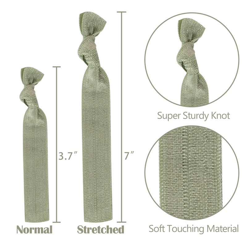 - Our olive green color package contains 100 pack solid color hair ties. Our hair ties are made of very soft fold over elastics with a satin look finish. Each hair tie measures approximately 3.7 inches in length (including the knot), when laid flat, allowing you to store an unused band comfortably on your wrist.