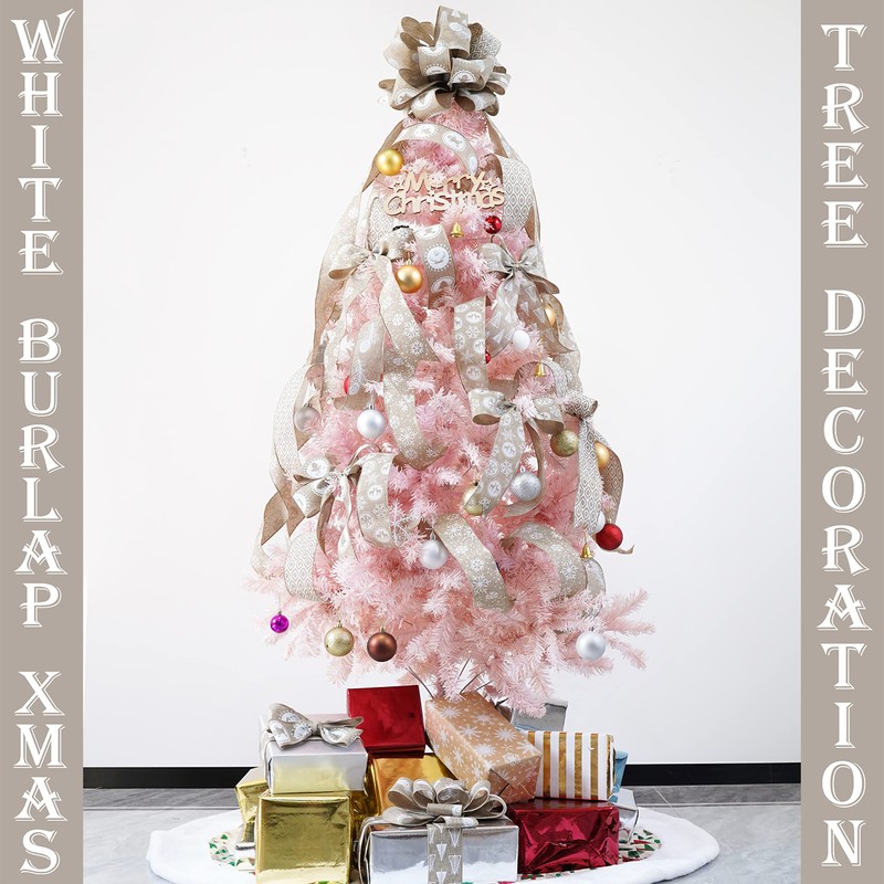 MEEDEE Christmas Ribbon Burlap and White Print Ribbon Wired Burlap Ribbon 2.5 Inch 6 Rolls 36 Yards Christmas Tree Burlap Ribbon for Wreaths Christmas Tree Decorations Ribbon Garland