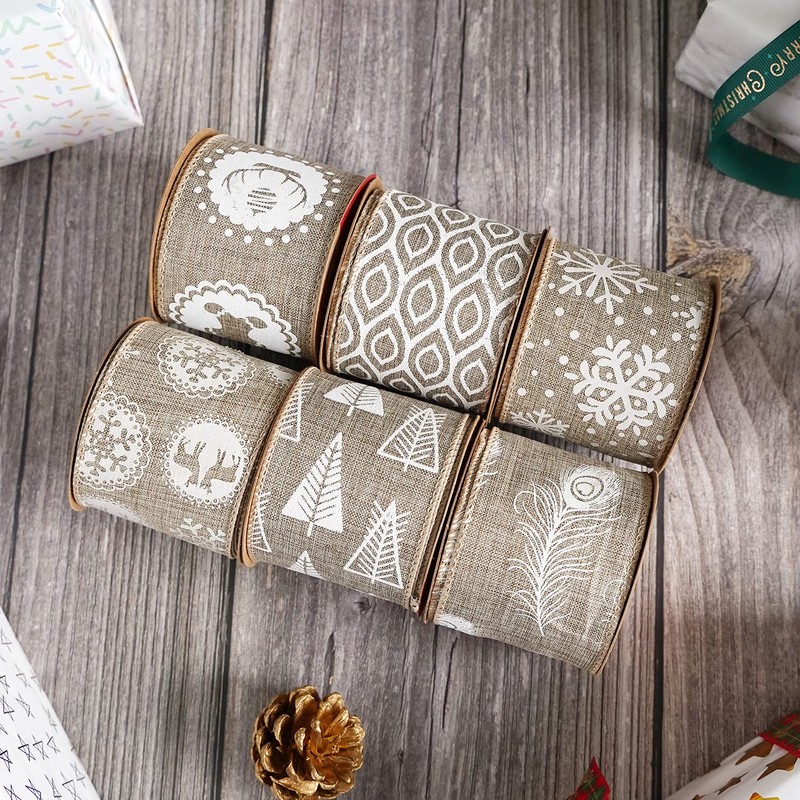 - Package includes: 6 yards of burlap and white christmas design ribbon, 6 yards of white feather ribbon, 6 yards of burlap and white reindeer ribbon, 6 yards of white snowflake ribbon, 6 yards of white burlap tree ribbon, and 6 yards of white peacock burlap wired ribbon. You will receive all of the ribbons shown in the photos – a set of 6 designs, each measuring 2.5 inches wide.