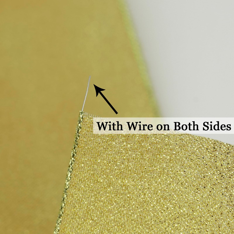 - The beautiful gold color and premium quality offer endless possibilities for decorative accents. The sewn wire edges allow you to create stunning bows that hold their shape beautifully. Incorporate this shimmering ribbon into your holiday décor, wedding arrangements, or gift presentations for a glamorous finish.