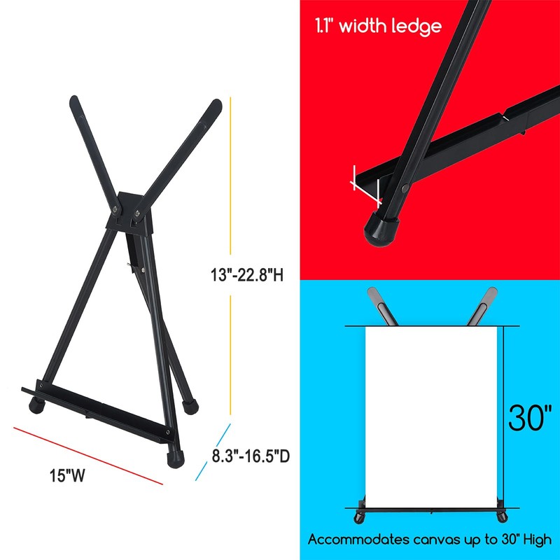 - Compact Size - Single easel collapsed size 3.7" wide by 16.1" height. Unfolded size 15" wide by 16.5"max depth by 22.8" max height. Support bar width 13.4" and bar tray depth 1.1". Easel weight 1 lb.