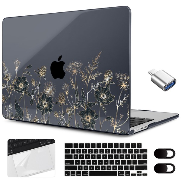 MEEgoodo for M3 MacBook Air 15 inch Case 2024 2023,Clear Case Fit Model A3114 A2941 with M3/M2, Laptop Hard Shell with Keyboard Cover & Camera Cover & OTG Adapter for 15.3-inch, Golden Flowers & Herbs