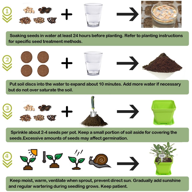 - TIPS FOR HERB GROWING: (1) Seeds should be fully soaked in advance. (2) Seed one or half bag of seeds in each pot according to seeding density. (3) Soil disc should be soaked in water before use. (4) Suitable temperature, sufficient water and air, and light shading are essential for germination, but give proper sunlight after the leaves arise. (5) Time for sprout varies from different seeds. Generally it takes 2 to 8 weeks. Refer to the introduction & growing guide for more details.