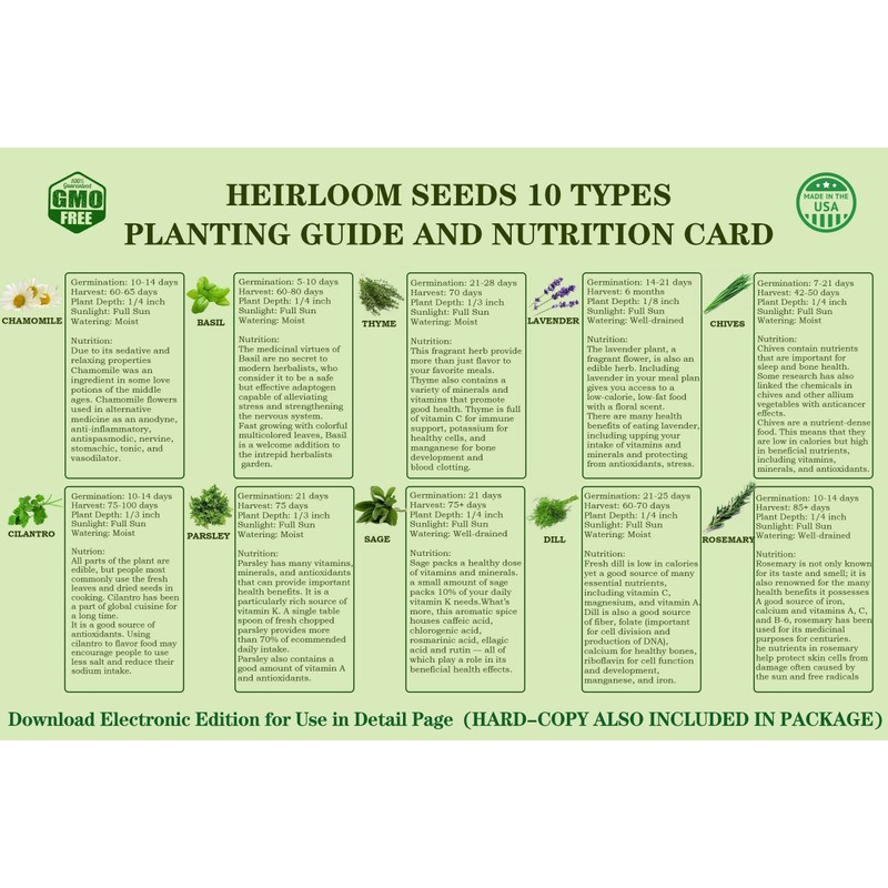 - DIY A SMALL INDOOR HERB GARDEN: We provides seeds that grow into Chamomile, Basil, Parsley, Rosemary, Thyme, Lavender, Chives, Cilantro, Sage, and Dill. All these herbs seeded on your own would be safer and greener to eat, and very suitable to be put on the kitchen's windowsill especially so that you can get and cook with the freshly plucked.