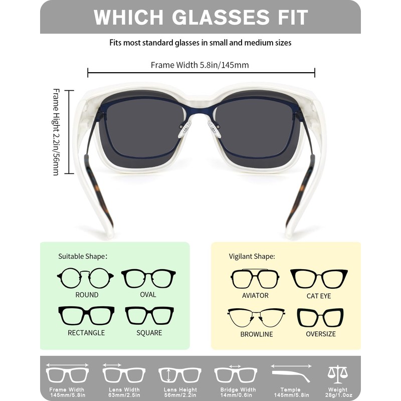 - [FIT OVER GLASSES] Designed for those who wear prescription & reading glasses. The groove of the temple and big square frame can fit most glasses. You can enjoy wearing glasses and sunglasses at the same time.