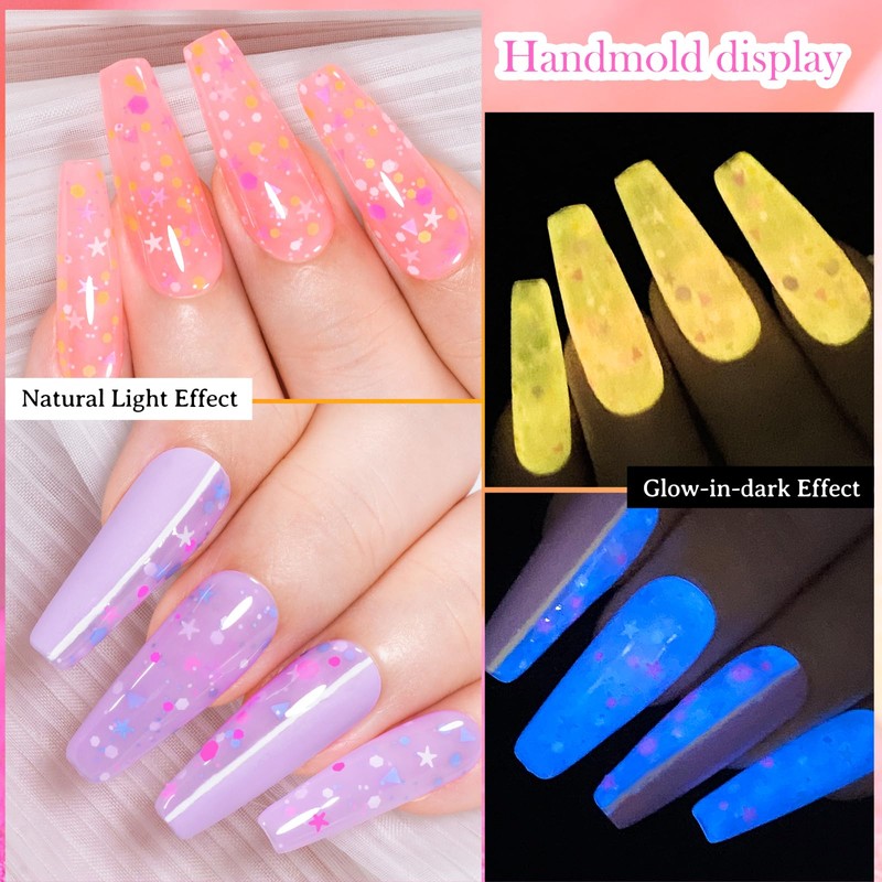 - Glow in the Dark Gel Nail Polish Set: 6 colors sequins jelly glow in the dark gel polish, 2 colors candy jelly glow in dark gel polish, 1 base polish coat,1 top coat, 1 nail prep dehydrator and 1 nail primer. This Glow in the dark gel nail polish kit comes in an exquisite packaging present box, making it the ideal choice for female or male friends, a great present for weddings, Halloween, Valentine's Day, Christmas, parties, masquerades, etc.