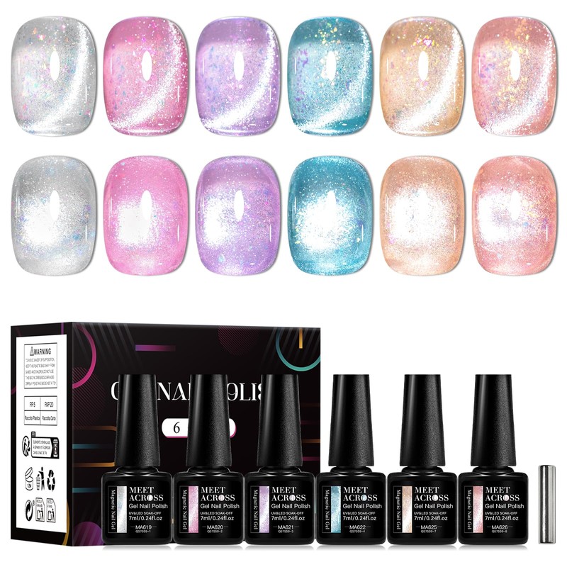 - 7PCS Magnetic Gel Nail Polish: You will get 6 colors fruit basket cat eye gel nail polish, 1 magnetic stick, super suitable for all seasons, which provides you with multiple nail designs. This set is perfect for any occasion and is sure to make a lasting impression with its sparkling and glamorous nail art