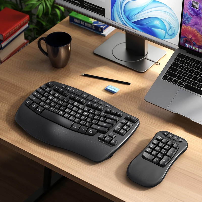 - 【FLEXIBLE COMBO】The 2-in-1 ergonomic wave keyboard features a split design. The keyboard and the numeric keypad can be freely combined to support flexible layouts for both left and right hands. Left-handed users can put the numeric keypad on the left to match their habits. When space is tight, store the numeric keypad and use only the main keyboard to save space.