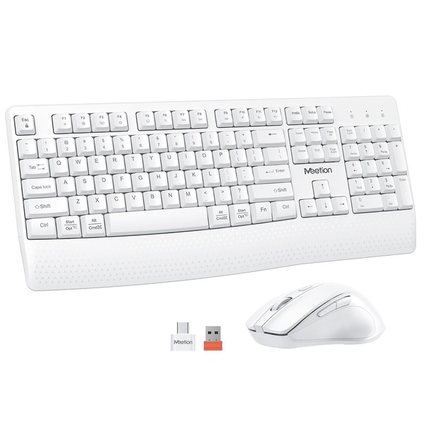 MEETION Wireless Keyboard and Mouse White, 2.4G USB Receiver Plug-and-Play, Computer Keyboard with Wrist Support, 3 Level DPI Mouse, Long Time Lasting Battery for PC/Mac/Windows/Laptop, White