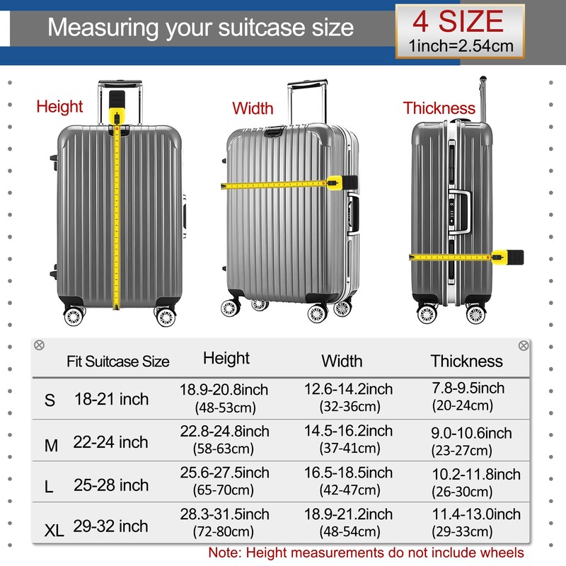 - There are 4 sizes to choose from, suitable for almost all suitcases. S: Suitable for 18-20 inch suitcases, M: Suitable for 22-24 inch suitcases, L: suitable for 26-28 inch suitcases, XL: suitable for 30-32 inch suitcases. Please refer to the size measurement method of the details to select the size accurately.