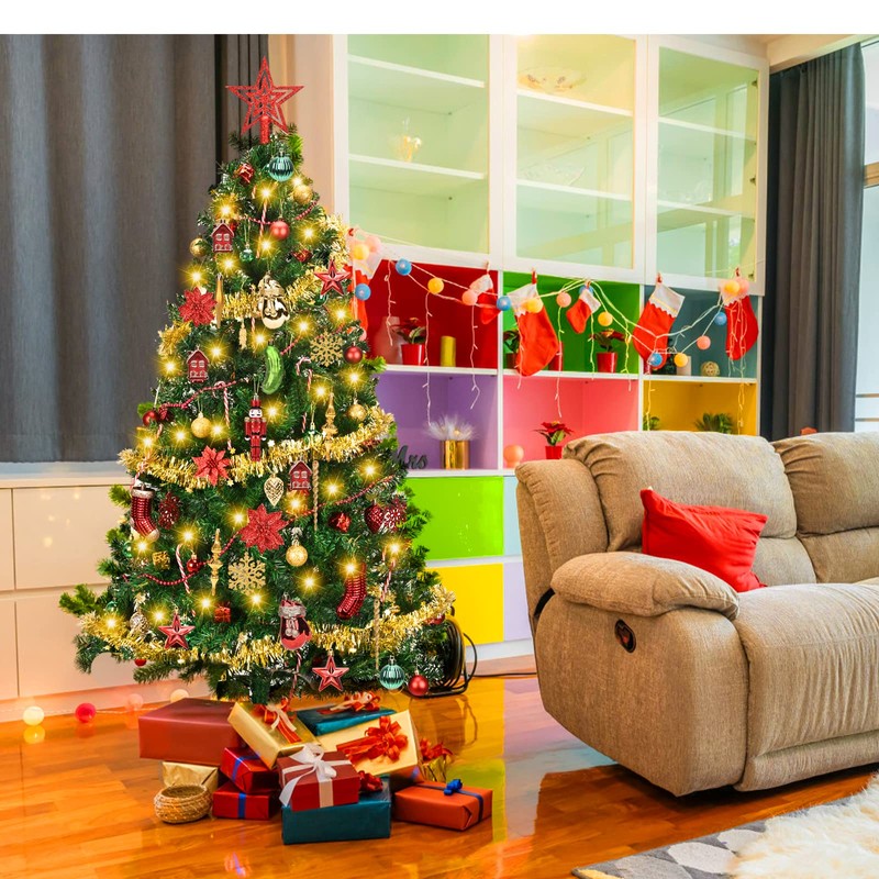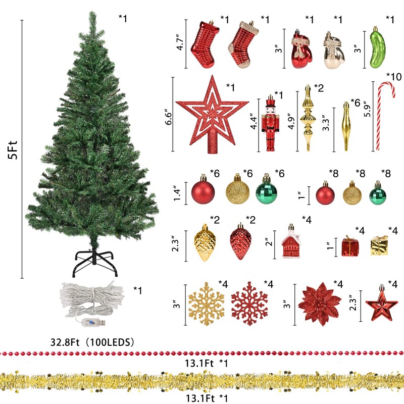 - Package: You will receive 1*5ft/1.5m artificial Christmas tree, 1*tree topper, 1*32.8ft 100led string light, 1*13ft tinsel,1*13ft red string-bead, and 98*different shapes and sizes of Christmas ornaments, which are hanging on the Christmas tree and make the house full of holiday joy and happiness. The balls are equipped with string hangers and hooks. It is convenient to hang or take-down.
