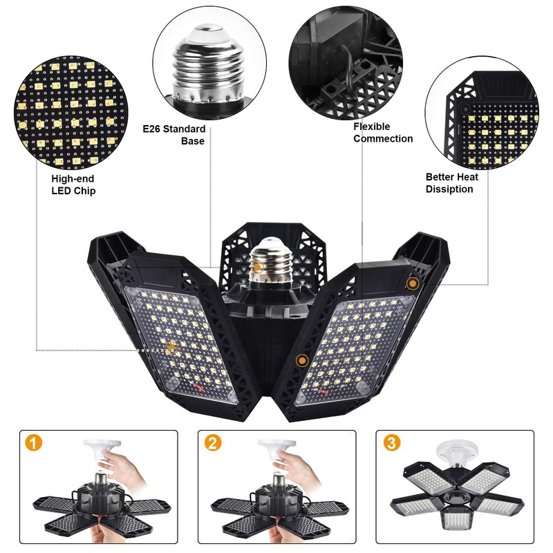 - Easy Installation: Open the box, cut off the power supply, climb your ladder, just screw it in the E26/E27 holder. No tools needed and without bothering the Electrician, after reconnect your power, and enjoy your new garage light.