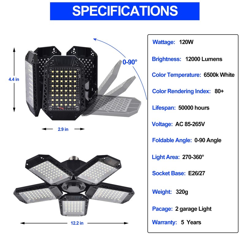 - Energy Saving: The garage light has five super bright adjustable led light panels, with a total lumens of 12000 lumens, no flickering, energy saving, providing a bright and bright indoor lighting experience for your garage