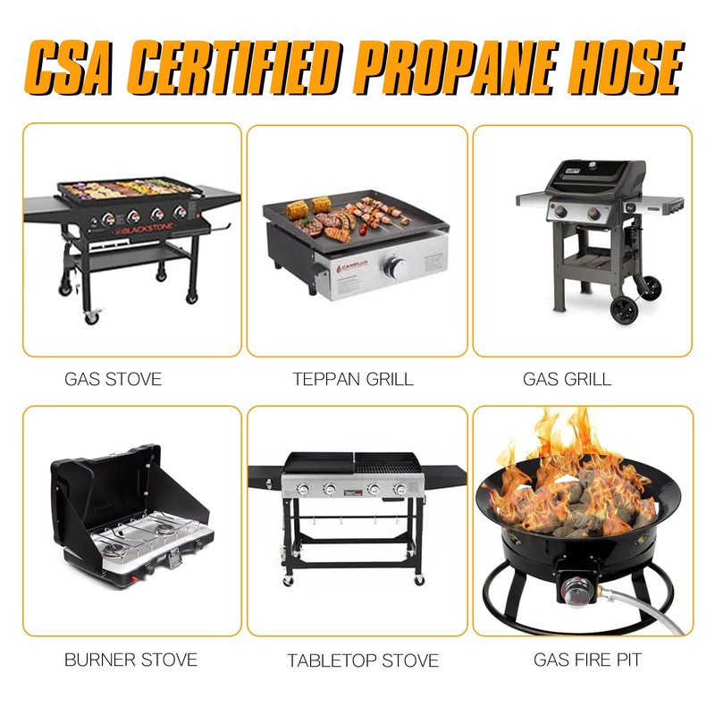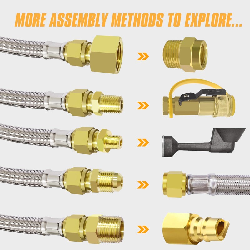 - 【Premium Material】6ft 3/8" female flare fittings on both ends and 6 different types of adapters fittings kit of this 3/8" propane hose are made of 100% Solid Brass to ensure secure and durable for long-lasting to use. The 6ft 3/8” Female Flare propane hose is made of durable stainless steel braided with anti corrosion, anti-aging, air tightness, heat-resistance, flexibility features. This propane extension hose with CSA Certification, ensures air tightness and stability.