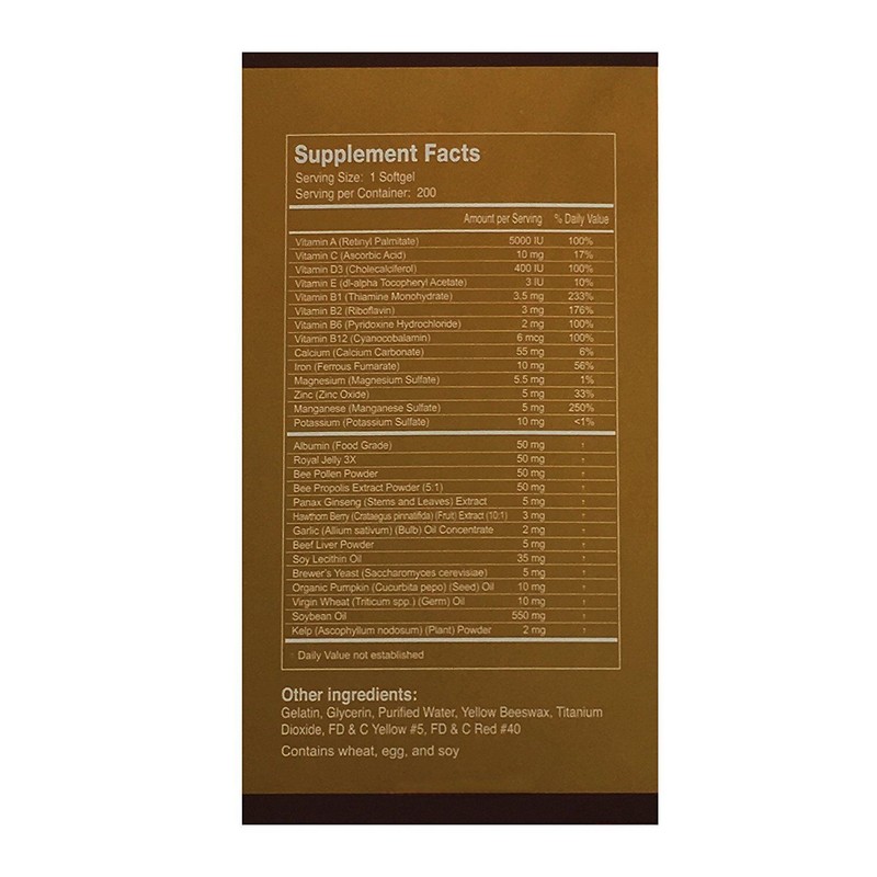 Ingredients: Albumin (Food Grade), Royal Jelly, Bee Pollen, Bee Propolis, Vitamin A, Vitamin C (Ascorbic Acid), Vitamin D3 (Cholecalciferol), Vitamin E (dl-Alphatocoperhyl Acetate), Vitamin B1 (Thiamine Mononitrate), Vitamin B2 (Riboflavin), Vitamin B6 (Pyridoxine Hydrochloride), Vitamin B12 (Cyanocobalamin), Calcium (Carbonate), Iron, Magnesium Sulfate, Zinc, Maganese Sulfate Dried, Potassium Sulfate, Panax Ginseng Extract, Hawthorne Berry Powder, Garlic Oil, Beef Liver Powder, Lecithin, Brewer's Yeast, Pumpkin Seed Oil, Wheat Germ Oil, Soybean Oil, Kelp.