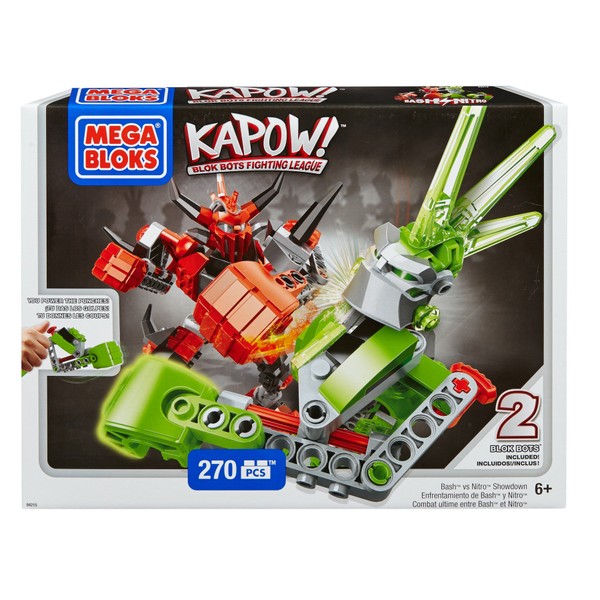 Prepare for an epic brawl with the Bash vs. Nitro Showdown by Mega Bloks Kapow! Bash and Nitro are two of the most powerful bots to enter the arena, with both sides battling for victory in the Kapow! Blok Bots Fighting League! Brace yourself for the brute force of Bash. With his signature volcanic red blocks, this unpredictable brawler uses the Bruiser Backfist to deliver a calculating series of blinding, body jabs. And in the other corner, Nitro, the scrappy street fighter, prepares his rapid right chop, the Radioactive Corkscrew! His mighty mohawk and graphic green blocks make him an unforgettable and worthy opponent. Ideal for ages 6 and up.