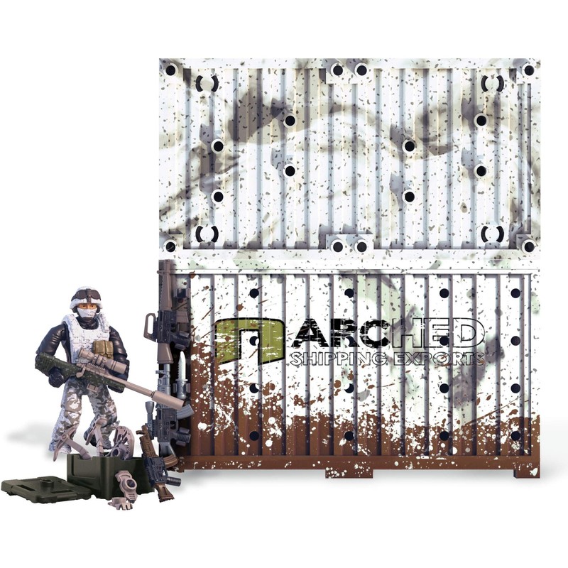 - Buildable arctic-themed shipping container with printed Call of Duty detail that opens to create an armory with a buildable weapons rack