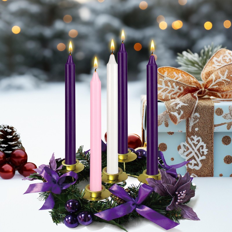 - ELEGANT ADVENT TRADITION: Celebrate the Christmas Advent season in style with our Mega Candles Advent Straight Taper Candle set, 3 Purple, 1 Pink and 1 White. These beautiful taper candles are designed to fit perfectly into your Advent wreath, adding a touch of elegance to your holiday traditions.