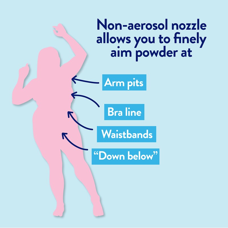 - LESS-MESS APPLICATION - Non-aerosol pump deposits powder directly where you want it, like directly into shoes, waistbands, and bra lines